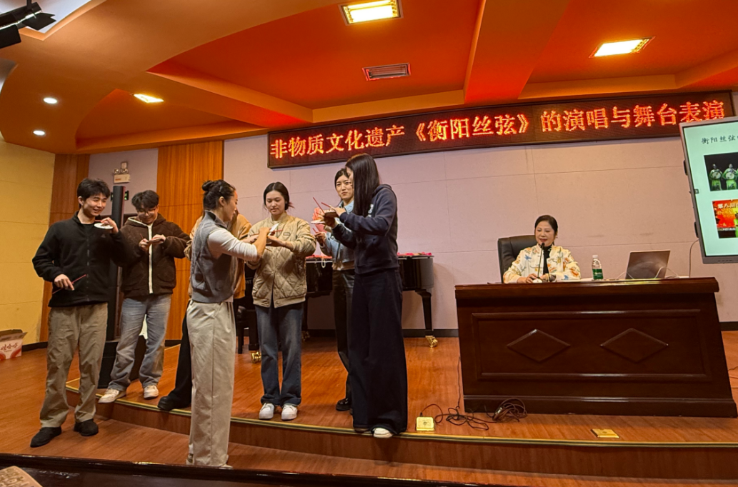 随后,活动互动环节,江老师的传承弟子陈芳宾逐项介绍并展示了衡阳丝弦丰富的表演道具:盘子、筷子、酒杯、扇子、手绢等等,并邀请了6位研究生上台,指导他们用两根竹筷和一个盘子进行辅助表演的方法与要领,从而巧妙地被用作节奏伴奏乐器,敲击出清脆多变的韵律;如何应用扇子做道具配合衡阳丝弦的舞台表演等等。六位同学在老师的指导下亲身体验了这些道具的运用,初尝了舞台表演中“手眼身法步”配合的乐趣和收获。