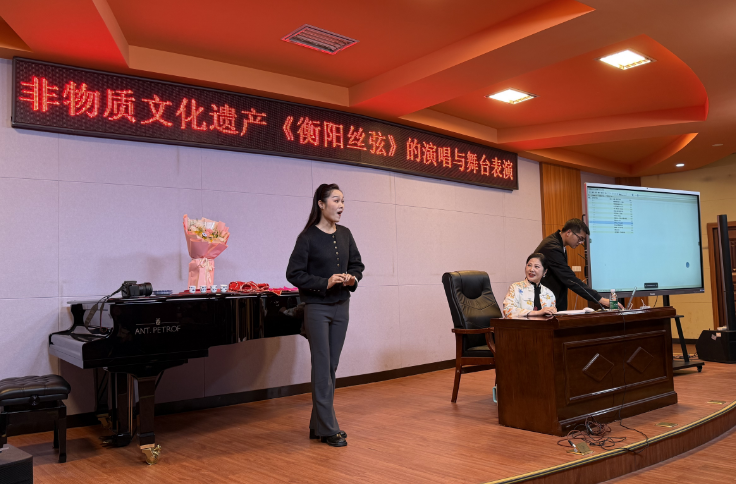 为了提升音乐硕士研究生的培养质量和舞台表演能力,加强行业导师对研究生的专业实践指导,2025年11月3日下午,衡阳师范学院客座教授、音乐硕士行业导师、国家一级演员,田汉剧目大奖获得者,省级非遗代表性项目《衡阳丝弦》传承人,舞台表演艺术家,衡阳市歌舞剧团有限责任公司董事长江春燕以《非物质文化遗产“衡阳丝弦”的演唱与舞台表演》为题在音乐学院501汇报厅开展学术讲座。音乐学院全体在读硕士研究生、硕士生导师和声乐教师及部分本科生参加了此次学术活动。